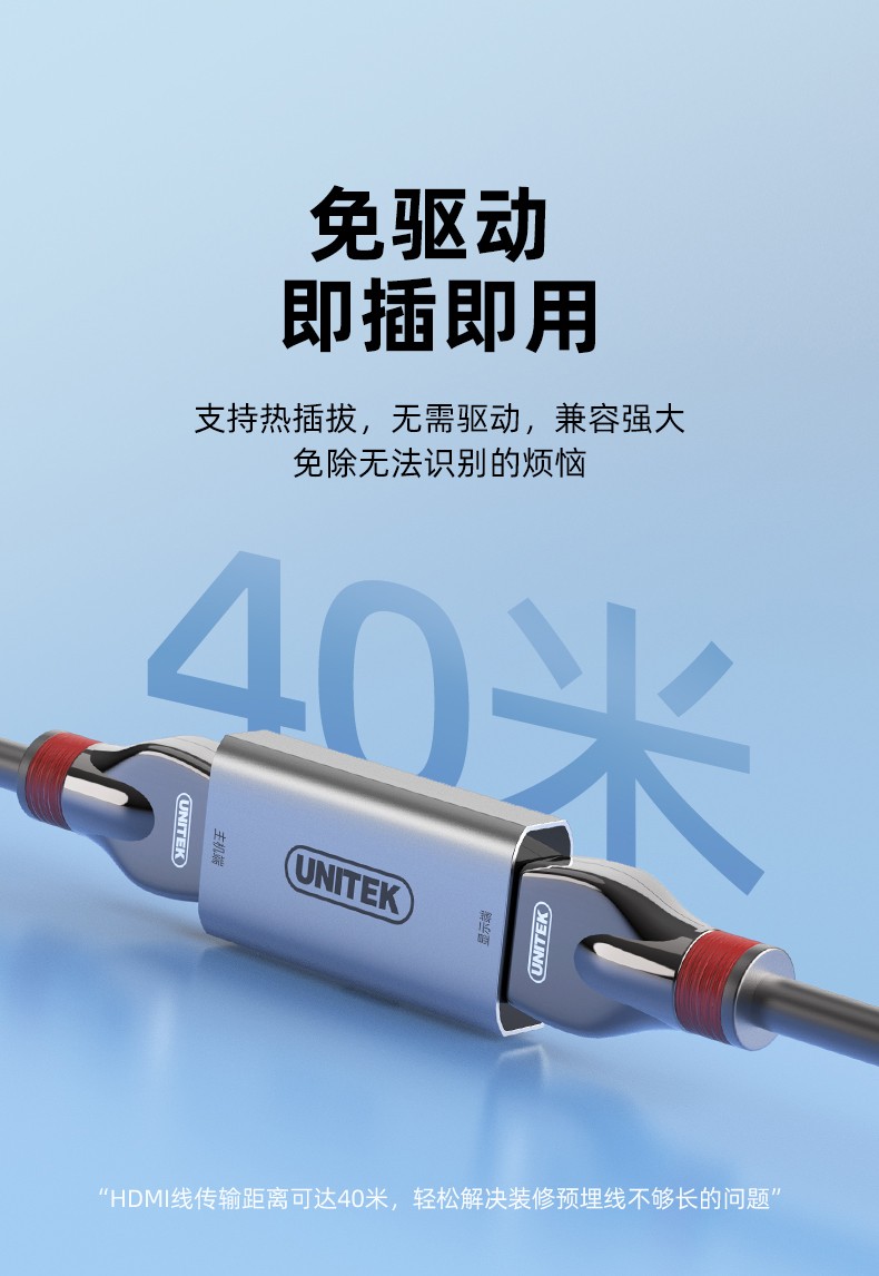 - Bộ mở rộng và khuếch đại tín hiệu HDMI UNITEK V166A hỗ trợ truyền tín hiệu HDMI chất lượng cao qua khoảng cách lên đến 40 mét mà không suy hao.