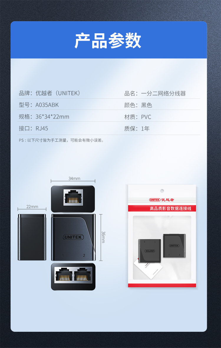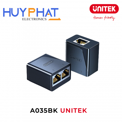 - Đầu nối mạng 2 chiều UNITEK A035BK giúp tách một cổng mạng thành hai cổng RJ45, tiện lợi khi sử dụng nhiều thiết bị cùng lúc.